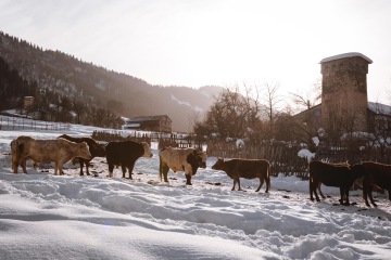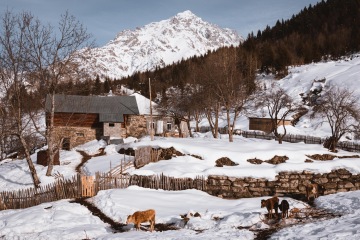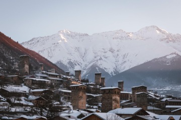 Rána v Mestii s výhledem na historické obranné věže a Kavkaz.