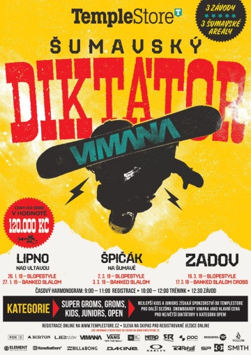 Kdo by nechtěl být největším šumavským diktátorem? K tomu vyhrát exkluzivní ceny nebo získat sponzoring na další sezónu? Neváhej a přihlaš se do šumavské diktátorské tour 2019 pod taktovkou TempleStore, Michala Rittera z Freestyle Area a Kuby Závory ze zadovského snowparku.