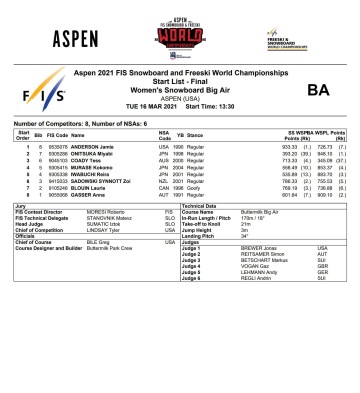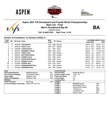 Pojďme se teda rychle podívat, kdo se nám ve finále představí a kdo se zase nepředstaví. Bohužel Šárka Pančochová ani Samuel Jaroš se přes nabitou včerejší kvalifikaci nedostali a ve finále je teda neuvidíme. Klaudii Medlové finále uniklo o pouhé dvě mista. Sice ve finále neuvidíme žádné Čechy a Slováky, ale rozhodně se můžeme těšit na pořádnou podívanou, jak už tomu tak v Big Airu bývá. Startovací listiny vám přikládáme níže. Tak zítra sledujte s náma!
