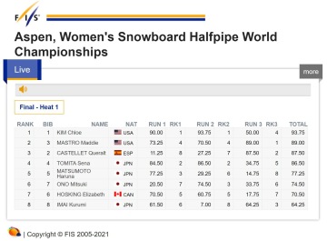 Stejně jako v mužské části, tak i v té ženské se pódiové pořadí poslední dobou moc nemění. Královnou celého závodu se hned po první jízdě stala dvaceti letá Američanka Chloe Kim s jízdou za čistých 90.00 bodů. V druhé jízdě se jí podařilo přidat ještě pár dalších vylepšení a celkově zlepšit čistotu, čímž si vysloužila finálních 93.75 bodů. Mimochodem pokud se na závod budete zpětně koukat, tak si všimněte, jak Chloe Kim kulhala. V tréninku si totiž podvrtla kotník a jediné, co jí i navzdory tohoto zranění šlo byl snowboarding. Někdo v takovém případě chodí o berlích, ale Chloe Kim stačí snowboard. Je to prostě úlet, haha.