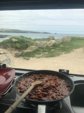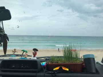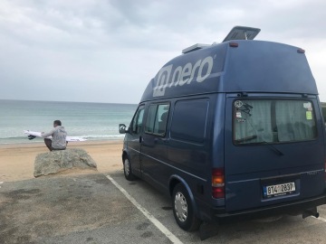Po pár dnech cigánství začaly závody. Vlny byly malý a rozfoukaný, ale vlastně jsme si na to už zvykli, takže moc nenadáváme. Já jel na prkně 6,8 s výtlakem 46 litrů, což nebylo špatný. Mila si z Indo přitáhly jednoho shorta (kterej byl celou dobu zavřenej v autě a ani jednou nebyl ve vodě haha) a jednu fishku, která na tom byla podobně (jen ve Walesu ji pujčil brazilcovi, kterej na ní vyhrál celej contest). Mila si teda půjčil pěňáka, který byl na ty podmínky ideální. V semifinále byl dokonce do poslední minuty první, potom ho přeskočil lokál PegLeg. I tak se ale probojoval do finále a to “stálo za to” :D. Byl to totiž skoro úplnej flat a celý závodní dění se tak konalo asi 10m od pláže na shorebreaku. Takže si představ, že uděláš takeoff a už se ti boří finy do písku. Skvost. Mila v heatu skončil 4. a získal tak první umístění z naší tour. Lepší začátek snad být nemohl!