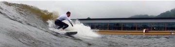 A je to tady - wavepool. Betonová šílenost uprostřed hor. Když jsme poprvé uviděli tu vlnu, přišla nám hrozně rychlá. Pak jsme měli tréningovou session a poprvé šli do vody. Bylo to fakt šílený. První hodinu se musí člověk vůbec zorientovat, kde vlastně má být a co má dělat. Je potřeba být přesně na jednom místě. U toho se držíš plotu, protože by tě voda v bazénu jinak odtáhla někam fuč. Až je vlna asi 2s za tebou, odrazíš se od plotu, uděláš 3 rychlý tempa a seš tam. Když už se člověk na vlnu dostane, vždy si myslíš, že máš jet na druhou stranu. Ale ne, musíš jet tak, jako bys to chtěl poslat přímo do toho plotu, který lemuje celej bazén a je za ním ta šílená mašina vytvářející vlnu. Samozřejmě jsem první vlnu nechytil a Mila se mě na břehu škodolibě vyptává, proč jsem tu vlnu nechytil jako. Nevím, co mu na to říct, je to divný :-D Postupně jsem se ale nějak zorientoval a jezdil už celý vlny. Po půl hodině mýho „ježdění“ přišel Mila, který nedokázal za celou dobu chytnout ani jednu vlnu. „Proč si ji nechytl?“ Ptám se ho s nadsázkou? Ale radši se mu moc nesměju, protože byl fakt nasranej. Vem si to takhle, nechytneš vlnu, jseš kilo mínus. Za hodinu ježdění totiž zaplatíš v přepočtu cca 1000 Kč . Před závodem jsme měli ještě jednu session, na kterou jsme se vyzbrojili zásobou prken, abychom vyzkoušeli, co je lepší. Já zůstal u svý 6,8. Milo to prostě nějak nepobral a nemohl chytit vlnu ani na pěňáku. Natočili jsme se, abychom tomu přišli na kloub, ale na nic jsme nepřišli. Mila to asi zkrátka zaklel tou škodolibou větou, haha. Ještě večer před závodem jsme si dali session na skejtech a samozřejmě, co se nestalo. Klasickej pád na skejtu, při kterým si ohneš kotník a uděláš si výron. Skvělá příprava na závodní den ne? Hned jsem to zledoval a i když jsem měl dost napuchlej kotník, na prkně jsem se nějak udržel.