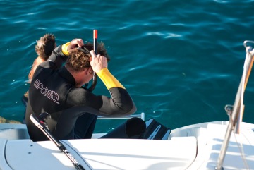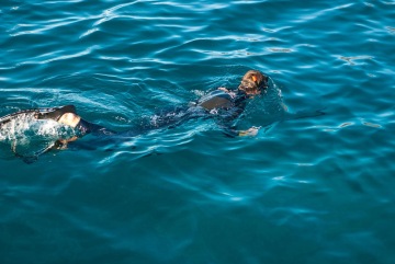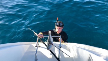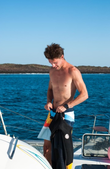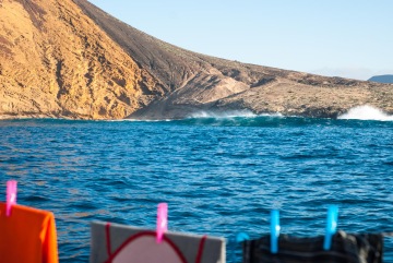 Z dopoledního šlofíka mě probouzí hlasité jásání z paluby, jdu se podívat co se děje. Okamžitě se ke všem přidávám a vyjadřuji hlasitě obdiv k tomu, co máme před očima. Dokonalá pravačka, valící se podél obrovské skály, kde se každou chvílí objevuje nemalý barrel. Dejv a Kid se vrhají do vody jako první a míří do půlky vlny, kde chtějí na rozježdění chytat “zbytky”. Po chvilce se k nim připojujeme a na místě teprve pořádně zjišťujeme, co je ta vlna zač. Hodně rychlá pravačka lámající se o velké oblé balvany, která má pořádnou sílu. Mně zatím stačí výhled na lokály, kteří dávají neuvěřitelné jízdy s barrely a podporuji Dejva, který jako jediný z nás jezdí. S účinkujícími prášky proti bolesti žeber si nakonec vlnu dá i Honza, která je podle Dejva, jenž ji viděl z boku, jeho největší a nejrychlejší vlnou ever. Všichni pádlujeme zpět na loď si trochu odpočinout a dát si něco k jídlu, přitom rozebíráme všechny zážitky z Lobos. Před druhou session ještě Dejv pokouší štěstí s harpunou a během chvilky máme na palubě čerstvý úlovek k večeři. Na druhou session na Los Lobos jsou všichni otrlejší a už i já se pokouším rozpádlovat tuhle vlnu, v mých očích bestii. Mezitím se Dejv vrhá na lineup mezi 30 dalších surfařů, kde si úspěšně bere menší vlny mezi sety. To jsem zapomněl zmínit, line up na Lobos je dost přecpaný a celý den tam vozí nové surfaře motorový člun z Fuerteventury. Očividně je to slušný business, protože tito přivezení surfaři mají na vlně i vlastní zázemí v podobě extra katamaránu, kde po surfování v klidu čekají na odvoz zpět na FUE. Los Lobos byl extra zážitek i pro nás co jsme si žádnou vlnu nedali, jsou to další zkušenosti ve vodě a příště už to pro nás nebude taková neznámá. Za mě je důležité si udržet zdravý respekt a vždy správně vyhodnotit své možnosti (mluví ze mě osobní zkušenost při rescue vodním skůtrem).