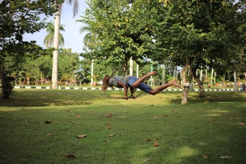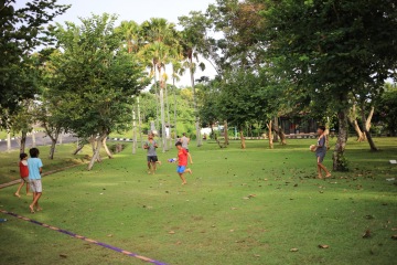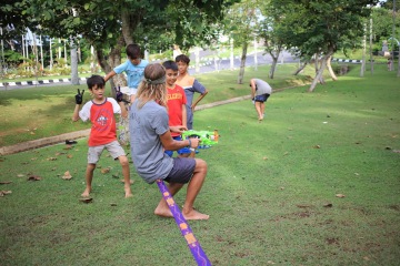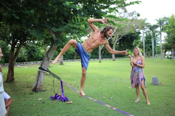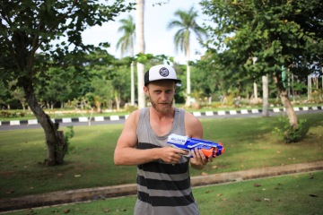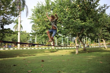A když už jsme měli dost pinčesu, surfskatu nebo protahování, vytáhli jsme v parku slacklinu a úřadující Robinson Marťas Složil nám předvedl jeho balanční skills. Kousek od nás si hráli lokální děcka s perfektní angličtinou a hračkama Nerf. Netrvalo dlouho a měli jsme bezpečný guny taky vypůjčený a snažili se vyfouknout dětem vlajku. Dostali jsme na prdel.