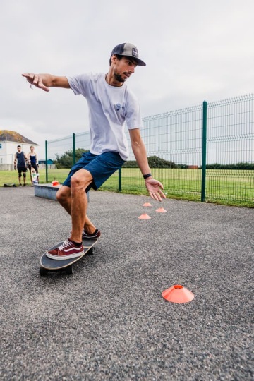Adam mi v tomhle směru úžasně pomohl. Ukázal mi, kam se můžu posouvat a co ze zlozvyků samouka odstranit. Nadchnul mě i jeho trénink na suchu na surfskatech – konečně si dokážu uvědomit věci, na které ve vodě vůbec nemám čas. A to i přesto, že jsem na surfskatu úplný začátečník.