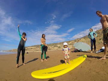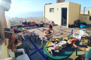 13:00-14:00 - Po lekci si mohl každý vybrat mezi obědem, či spánkem nebo obojím, aby pak stihl na druhou session před západem slunce. Umlčet hlad po takto náročném dni se opět stalo prioritou, a jelikož nezbyly ani síly na vaření, zamířili jsme si to většinou vyzbrojeny přístroji na sosání bezdrátových vln do Le Spotu (místní restaraurace, která vlastně ani tak místní nebyla, jelikož tam připravovali skvělou pizzu, nebo špagety…což nezní moc jako pokrmy marocké gastronomie). O jídle už radši psát nebudu, jelikož byste následkem čtení sami dostali hlad (možná jste si už všimli, že mám jídlo rád. A to především, když je servírované v gigantických porcích). Potom stačilo poslat telegram rodinám, že jsme v pořádku a buď hecnout sunset session a nebo se odkutálet domů na terásku k večernímu posezení.