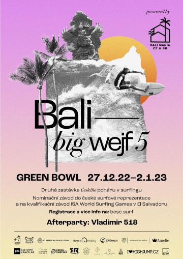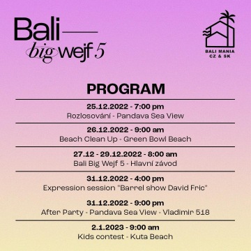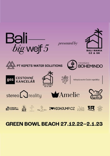 Přátelé a fanoušci skluzu na vlnách, schyluje se k bouři. Česká surfařská elita se za pár dní utká na ostrově bohů na Bali o titul a to v dnes již tradičním závodě Bali Big Wejf. Okno pro závod je mezi dny 27.12. 2022 a 2.1. 2023. Nejenom, že je tento závod letos druhou zastávkou Českého poháru v surfingu, na jižním pobřeží poloostrova Bukit se zárověň zaplní poslední místa v historicky první, české surfové reprezentaci. Ta pojede na přelomu května a června zastupovat české surfstvo do El Salvadoru na ISA Open Games. A tam jim ukážeme, jak hoblují vlny slované! Vyzpovídali jsme organizátora a všeobecnou legendu Petra Novotného. V následujícíh řádcích se dozvíte to nejdůležitější o jíž pátém ročníku Bali Big Wejf.