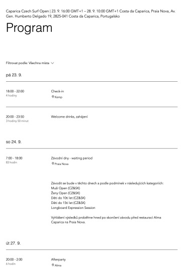 Letošní Caparica bude zas o kousek větší event než vloni. Tedy i kvůli tomu že vloni nás ještě omezovala covidová opatření. Letos budeme mít profesionální portugalské rozhodčí, závod evropského regionálního formátu (tentokrát i s prioritami od čtvrtfinále nebo semifinále). Dále se můžou účastníci těšit i na doprovodný program jako je beach market, společné ubytování v kempu Orbitur, surfová škola a Advanced Surf Training, jóga, nějaké welcome drinky, afterpártošky a tak.