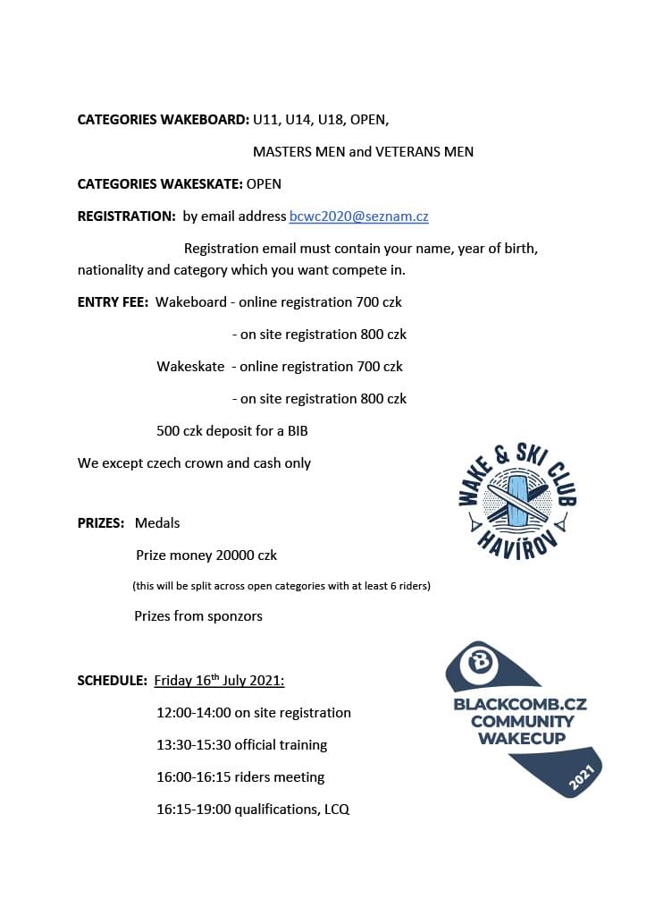 Závody jsou otevřené všem jezdcům, a to jak z Česka, tak i z okolních států jediné co stačí udělat je registrovat se. Otevřených kategorií je hned několik. Wakeboard se pojede U11, U14, U18, open, a to jak u mužů, tak u žen. Chlapi k tomu navíc budou mít i masters men a veterans men. Wakeskate to bude mít o to jednodušší, protože bude jenom kategorie open, a to zase jak pro holky, tak pro kluky.