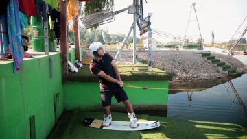 Jakmile se dostaneš na vodu, tak přenes váhu na obě nohy stejně a postav se na desku stejně, jako když jsi jezdil na malém vleku. To znamená mírně natáhneš ruce, srovnáš se rovně na desku a jízdou namíříš pod oběžné lano. Rozhodně ale nebudeš mít klid dlouho, protože poměrně rychle tě bude čekat první zatáčka. Pokud se ti start nepovede, tak se zbytečně nevysiluj a pusť se. Někdy je dobré zabojovat, ale taky musí mít člověk soudnost a když to nemá cenu, tak se pustit a zkusit to znovu.