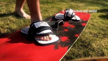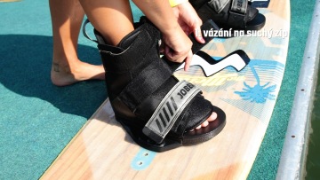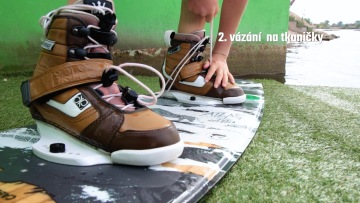 Na půjčovňáckých deskách je většinou vázání s otevřenou špičkou, do které se díky tomu dostanou i lidi s podobnými velkostmi nohy. Klidně si můžeš, pokud budeš chtít, půjčit i jedno prkno a s někým si ho střídat. Všechno ale předtím proberte v areálu, kde vám rádi poradí. Občas může být trochu oříšek se do vázání na wake dostat, a proto se určitě hodí, si ho předtím namočit. Utahování je řešené buď tkaničkou s utahovacím kolečkem, suchým zipem nebo se v půjčovnách můžete setkat i pouze s nasazovacím typem vázání. U tkaniček do boty vlezeme, uvolníme kolečko a posuneme ho k botě čímž ho utáhneme. Zbylou část tkaničky si můžeš zastrčit do boty, aby ti při jízdě nepřekážela. Suchý zip je nejjednodušší, tam jenom pásky utáhneme a přilepíme. Nakopávací styl vázání má většinou taky jeden pásek na zpevnění nohy, ale i přesto drží nohu o něco míň.