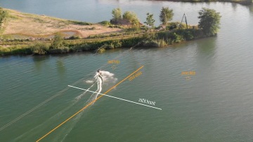 Pojďme ještě trochu zpátky a postupně. Jedeme hezky pod ocelovým lanem a jakmile se blížíme ke konci rovinky a jsme přibližně deset metrů před bójkami, tak začneme hranit přes paty směrem k nim, abychom ji mohli z venku objet. I přes to, že se vlek v jednu chvíli zastaví, tak ty pojedeš stále dál od lan a budeš setrvačností klouzat po hladině. Celou dobu se snažíme o to, aby lano zůstalo natažené. Během zatáčky dáme lehce váhu na zadní nohu, aby se nám nezapíchla špička, pokud lehce zpomalíme a začneme se bořit. Jakmile se vlek rozjede směrem zpět, ty už budeš mít zatáčku z poloviny obkrouženou a tah si tě stáhne zpět do nového směru. V tu chvíli je dobré zase přenést váhu víc do špiček, tím zatáčku doříznout a nenechat se zbytečně vytáhnout. Jakmile máš zatáčku v kapse, tak se zase srovnáš pod ocelové lano a valíš zpátky.