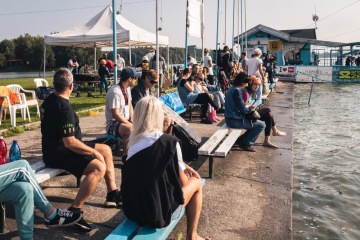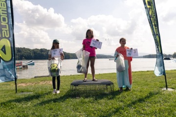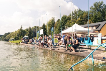 Těrlická přehrada v sobotu ožila jako to známe při každém závodě! Lavičky u mola se zaplnili rodiči a fanoušky z okolí. Vše začalo klasicky už v ranních hodinách, kdy byly na programu registrace. Jakmile byly děti oficiálně zapsány, tak rovnou skákaly na vodu, aby si stihly před závodem ještě natrénovat a připomenout všechny triky. Molo v tu chvíli skoro praskalo ve švech, když se na něj vyřítilo kolem 30 nedočkavých dětí! Všichni se ale nakonec na vodu dostaly a závod mohl pomalu začít.