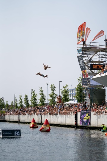 Aby Waterfest navíc nabral ještě trochu víc parády, tak se k závodu na wakeu přidala soutěž v Death Divingu. Kdo o téhle šílenosti ještě neslyšel, tak v death divingu skáčou lidi z 10-14 metrové platformy placáky a do toho dělají triky. Prostě mazec! Hodnotí se pak to, jak dlouho je člověk natažený, kam až doletí nebo co všechno při skoku stihne. Do finále se dokonce probojoval i námi známý wakeař Ryan Peacock, což je slušný výkon.