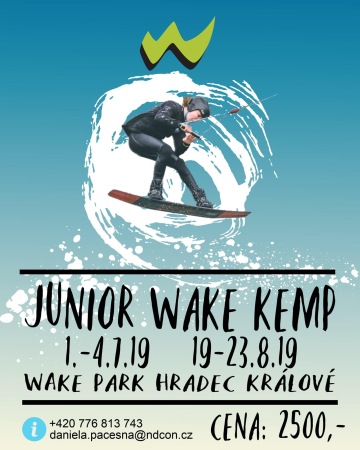 „Chcete aby Vaše děti zažili prázdninové dny u vody? Dny plné sportování, zábavných her a skvělých zážitků? Neváhejte a přihlaste je do Junior Wake Kempu, který pro Vás chystáme ve Wake parku Hradec Králové. Připraveny jsou hned dva termíny, ve kterých mají děti možnost přespání ve stanu, přímo ve wake parku, nebo formou příměstského tábora. V ceně je zahrnuta strava, pitný režim, ježdění na vleku, instruktoři a půjčení vybavení. Zájemcům o Wake Kemp budou následně zaslány bližší informace. Těšíme se na Vás :)“